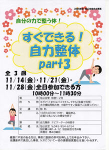 11月14日(金)から3週連続で、自力整体の講座「すぐできる!自力整体」を行います。