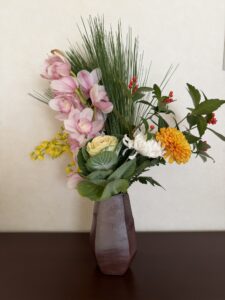 友人開催のお花教室で、正月のお花アレンジをしました。月1回のお花教室を続けて1年ちょっと。まだ下手ですが、日常に花がある生活っていいなと思います。