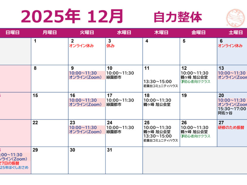 2025年12月の自力整体の予定です。 現在、リアル(対面)教室は、鶴ヶ峰(西谷の場合あり)、緑園都市、若葉台、高円寺教室です。 体験も大歓迎です。どうぞお気軽にお越しください。 また、リアル教室のほかにオンライン教室も …