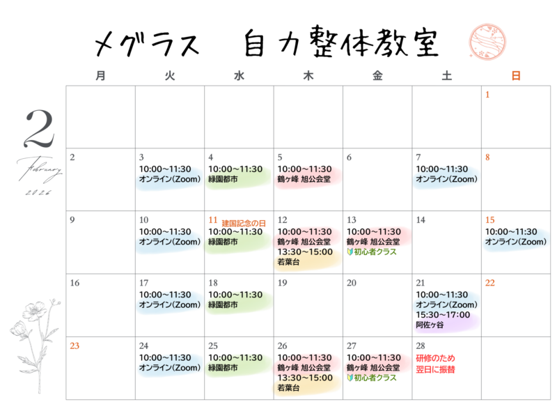 2026年2月の自力整体の予定です。 現在、リアル(対面)教室は、鶴ヶ峰(西谷の場合あり)、緑園都市、若葉台、高円寺教室です。 体験も大歓迎です。どうぞお気軽にお越しください。 また、リアル教室のほかにオンライン教室もあ …